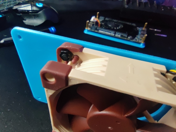 Der nächste Schritt besteht darin, den neuen Lüfter auf der Gehäuseoberseite zu montieren. Dazu werden einfach die 4 12mm langen M4 Schrauben und Muttern verwendet: